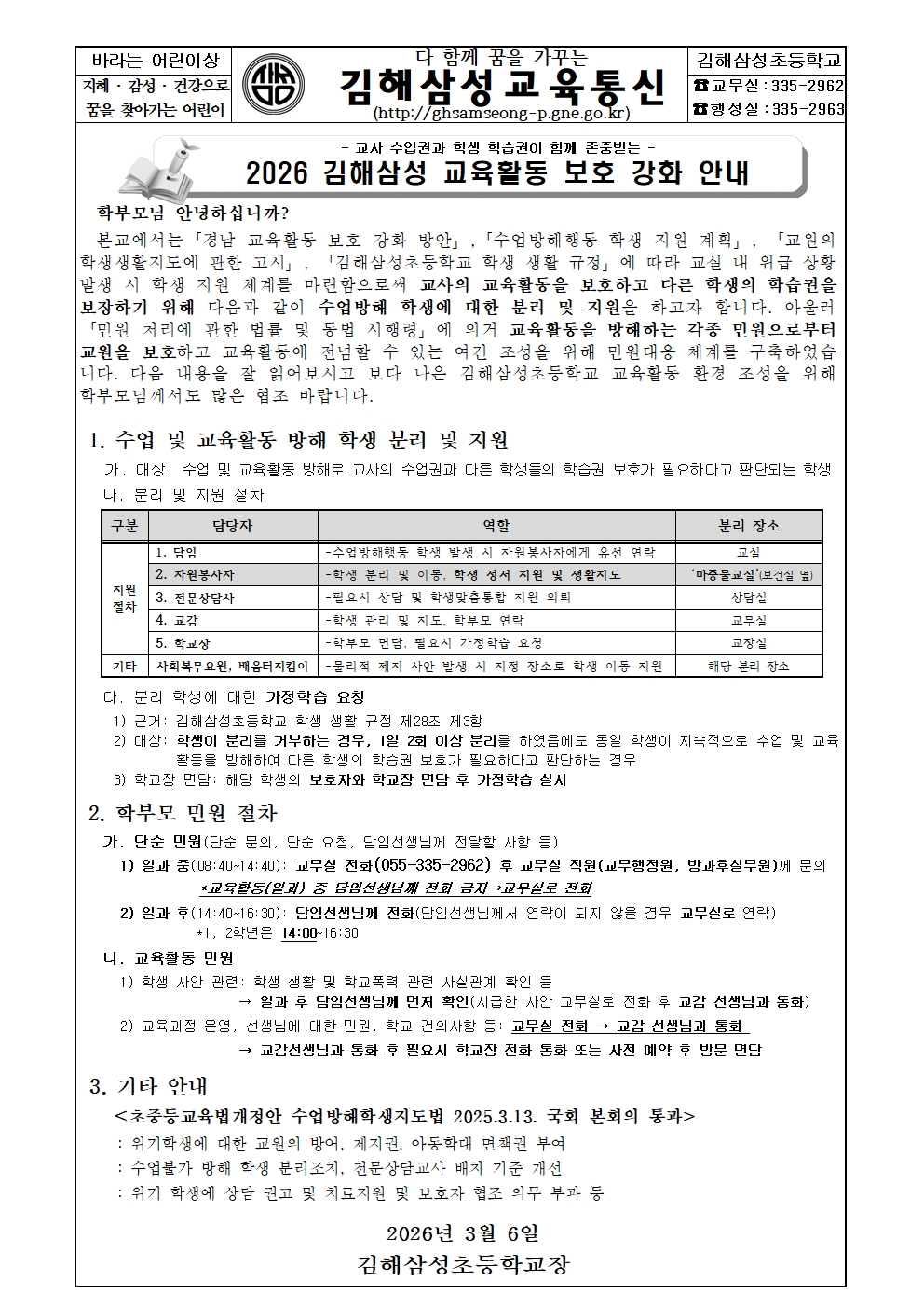 2026학년도 김해삼성 교육활동 보호 관련 안내